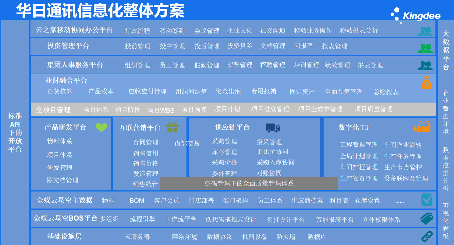 結(jié)合行業(yè)洞察分析和對企業(yè)自身企情況及能力的調(diào)研,金蝶認(rèn)為華日通訊需要建立業(yè)務(wù)平臺(tái)和運(yùn)營管控平臺(tái),實(shí)現(xiàn)深耕產(chǎn)業(yè)下的產(chǎn)業(yè)鏈數(shù)字化重塑的雙輪驅(qū)動(dòng)。從集團(tuán)管控和業(yè)務(wù)協(xié)同雙向指標(biāo)逐步建立起華日通訊的IT構(gòu)建架構(gòu)。金蝶認(rèn)為,解決華日通訊當(dāng)前面臨的挑戰(zhàn),可以基于金蝶云星空平臺(tái)的項(xiàng)目管理平臺(tái),通過該項(xiàng)目管理平臺(tái)對項(xiàng)目實(shí)現(xiàn)事前預(yù)測、事中監(jiān)督控制、事后分析的一體化管理,完善企業(yè)項(xiàng)目業(yè)務(wù)的全面協(xié)同和信息共享體系。