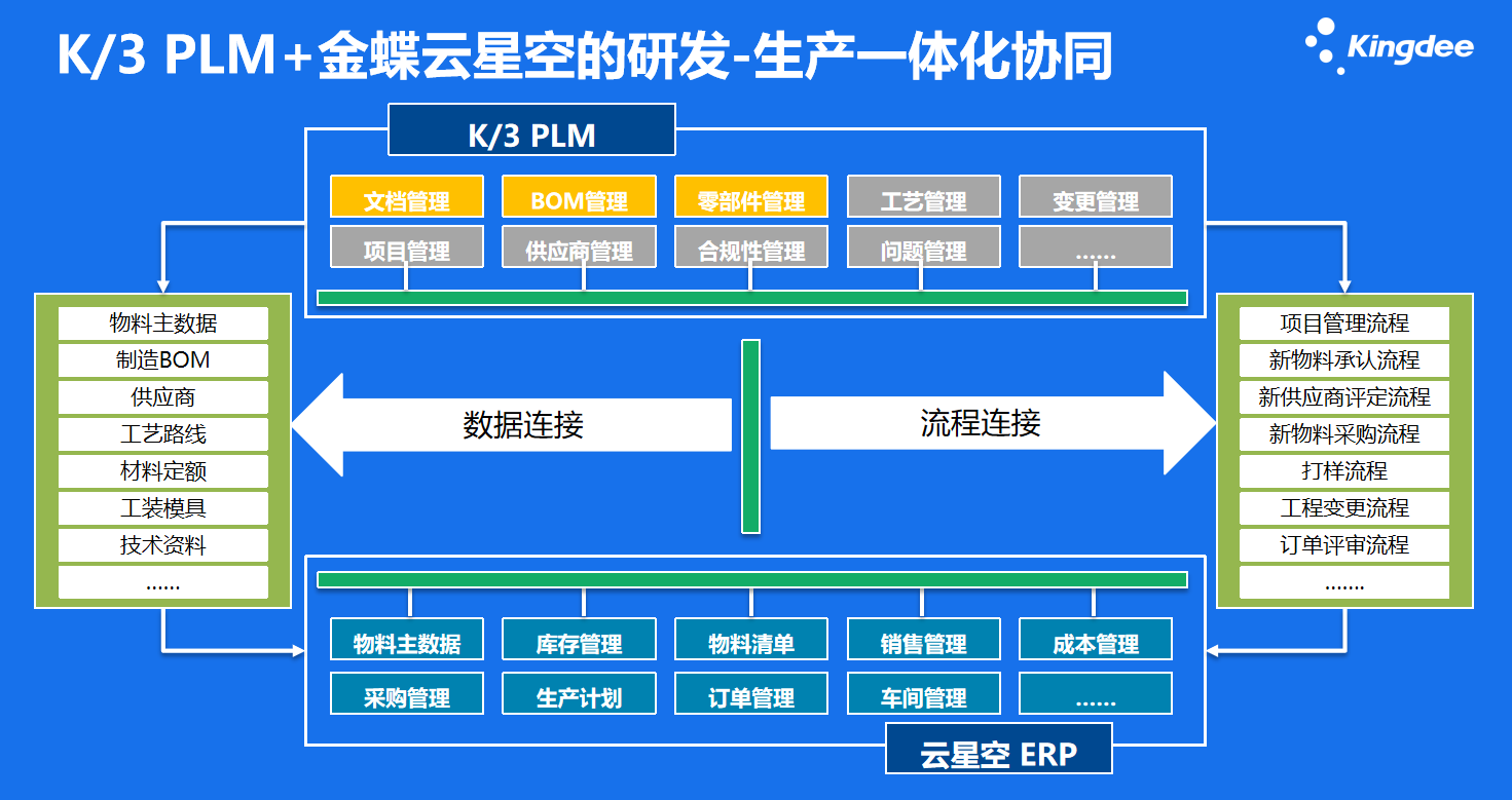 通過K/3 PLM和金蝶云星空的研發(fā)到生產(chǎn)流程的標(biāo)準(zhǔn)化支撐,打通企業(yè)數(shù)據(jù)和流程連街,實(shí)現(xiàn)研發(fā)生產(chǎn)一體化協(xié)同: