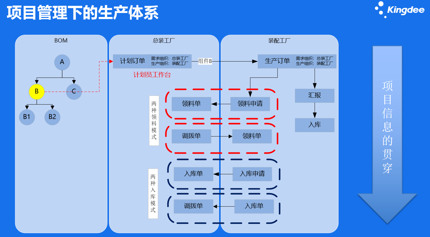 通過項(xiàng)目管理下的生產(chǎn)體系,完善企業(yè)生產(chǎn)從BOM到總裝工廠與裝配工廠的業(yè)務(wù)鏈條。通過兩種領(lǐng)料模式和兩種入庫模式解決總裝和裝配工廠之間的領(lǐng)料和入庫的繁雜混亂,幫助生產(chǎn)體系實(shí)現(xiàn)有效協(xié)同。