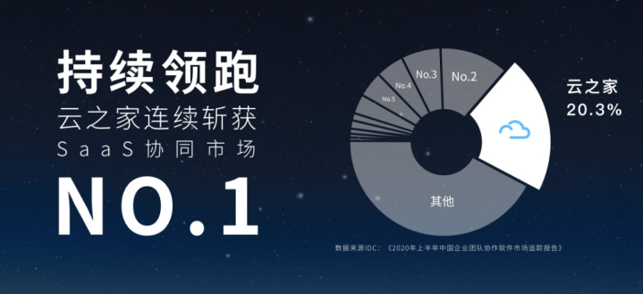 根據(jù)IDC近日發(fā)布的最新《2020年上半年中國企業(yè)團隊協(xié)作軟件市場追蹤報告》顯示:上半年云之家以 20.3%的份額再次蟬聯(lián)SaaS企業(yè)團隊協(xié)作市場第一名。據(jù)往年IDC數(shù)據(jù)顯示:云之家從2015年開始,連續(xù)3年在中大企業(yè)移動辦公市場占有率第一。從2018年至今,在SaaS企業(yè)團隊協(xié)作市場持續(xù)第一。