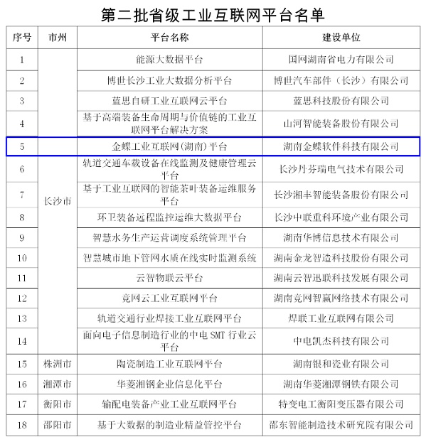 為加快打造國家重要先進制造業(yè)高地,推動工業(yè)互聯(lián)網(wǎng)在更廣范圍、更深程度、更高水平上的融合創(chuàng)新,根據(jù)《湖南省省級工業(yè)互聯(lián)網(wǎng)平臺認定管理辦法》(湘工信人工智能〔2020〕222號),經(jīng)企業(yè)申報、市州工信部門推薦、專家評審、現(xiàn)場核查、網(wǎng)上公示等程序,湖南省工業(yè)和信息化廳同意認定金蝶工業(yè)互聯(lián)網(wǎng)(湖南)平臺等18個平臺為第二批省級工業(yè)互聯(lián)網(wǎng)平臺。