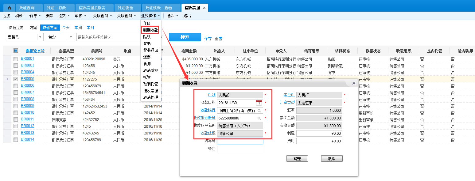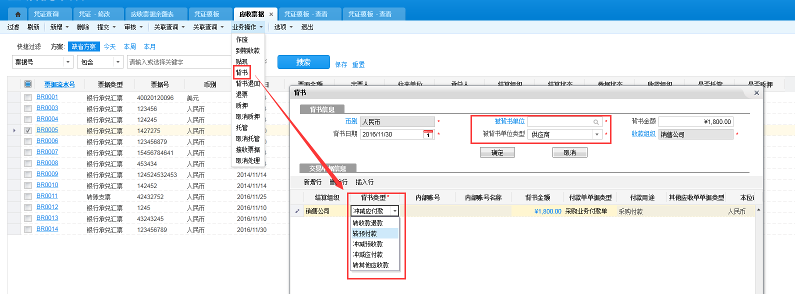 9、應(yīng)收票據(jù)的背書、背書退回、退票等操作需要考慮結(jié)算組織與收款組織是否一致,以上均是在結(jié)算組織與收款組織一致下生成的憑證情況,若不同會(huì)有其他應(yīng)收/其他應(yīng)付科目處理結(jié)算組織與收款組織之間的往來;