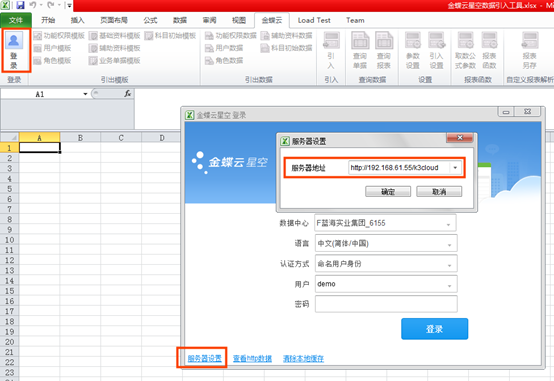第三步:在【金蝶云】頁簽點擊【登陸】按鈕登陸系統(tǒng)(登陸前需要先設(shè)置好服務(wù)器地址)。